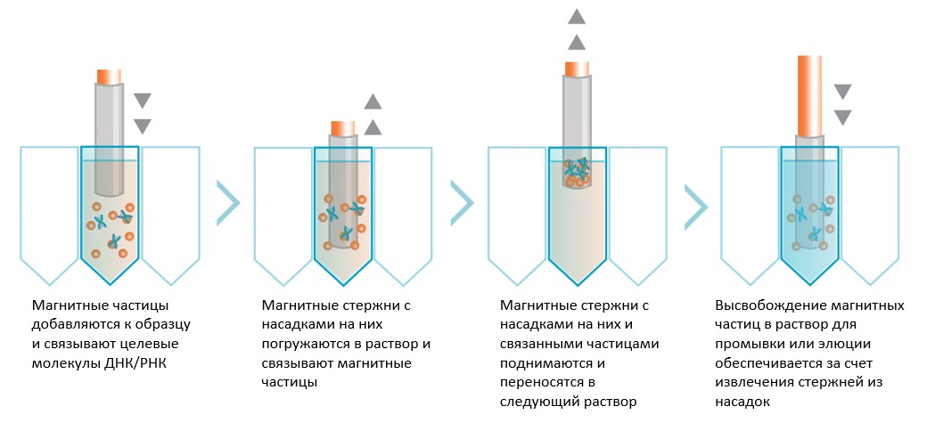 Выделение НК на станции Auto-Pure Mini основано на методе магнитной сепарации. Нуклеиновые кислоты из лизированного образца связываются с функциональными группами на поверхности магнитных частиц. Далее проводится несколько этапов промывок и элюция чистой НК (см.рис).